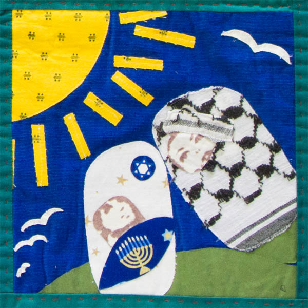 The religious symbols sacred to both peoples can be held close to the heart, close to the sun, and peacefully close to each other on the rich sacred soil. The Doves symbolize surrounding peace.