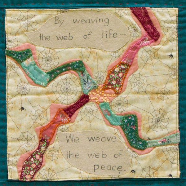 The spider web signifies both strength and fragility. When I found this spider web fabric it became important for me to work with it. My theme for my block for this Peace Quilt was to use it to illustrate the coming together of peoples from diverse backgrounds -- not just Israelis and Palestinians but people of differing faiths and multiple origins as are the peoples in this region. This is shown by the variety of fabrics in the four rays which lead towards the centre. The fragility of the web will likely always be there because commitment to peace requires continual renewal.