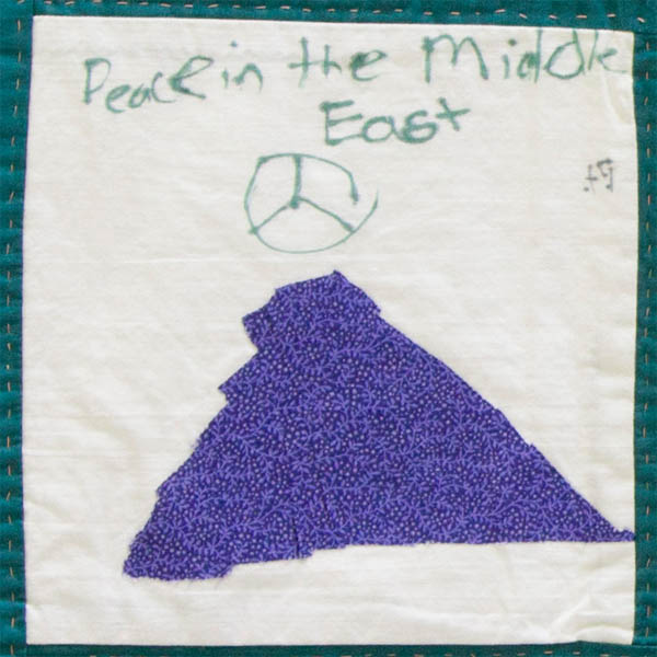 To the third through sixth grade classes of Agudus Achim Religious School, under the direction of Rabbi Tracy Klirs, the meaning of "Middle East Peace Quilt" is simple. We teach "Mitzvot" each month; this month our "Mitzvot" is "Rodef Shalom", (to pursue the peace). We teach that the pursuit of peace is one of the most God-like things we can do. Peace doesn't just happen. We need to seek out peace and make it happen. Discussing and contributing to the Middle East Peace Quilt for this lesson plan was a great way for the children to think of the peace process in the MIddle East, and a wholeness in the world.